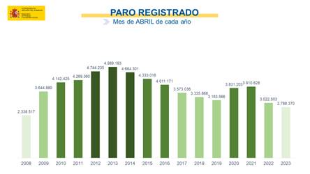 Respecto a abril de 2022, el paro interanual ha descendido en 234.133 personas (-7,75%).