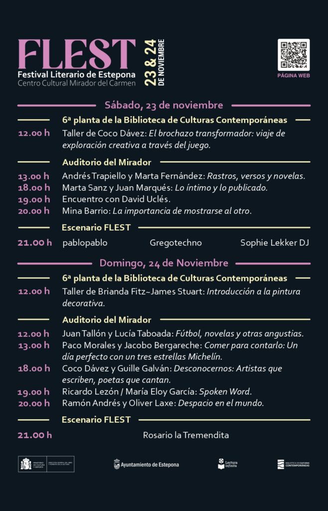 El Ayuntamiento de Estepona  presenta el Festival Literario de Estepona (FLEST), que reunirá a grandes nombres de las letras, la música, el periodismo o la gastronomía en un encuentro que se desarrollará los días 23 y 24 de noviembre. Este será el primer gran evento que acoja la nueva Biblioteca de las Culturas Contemporáneas del Mirador del Carmen.