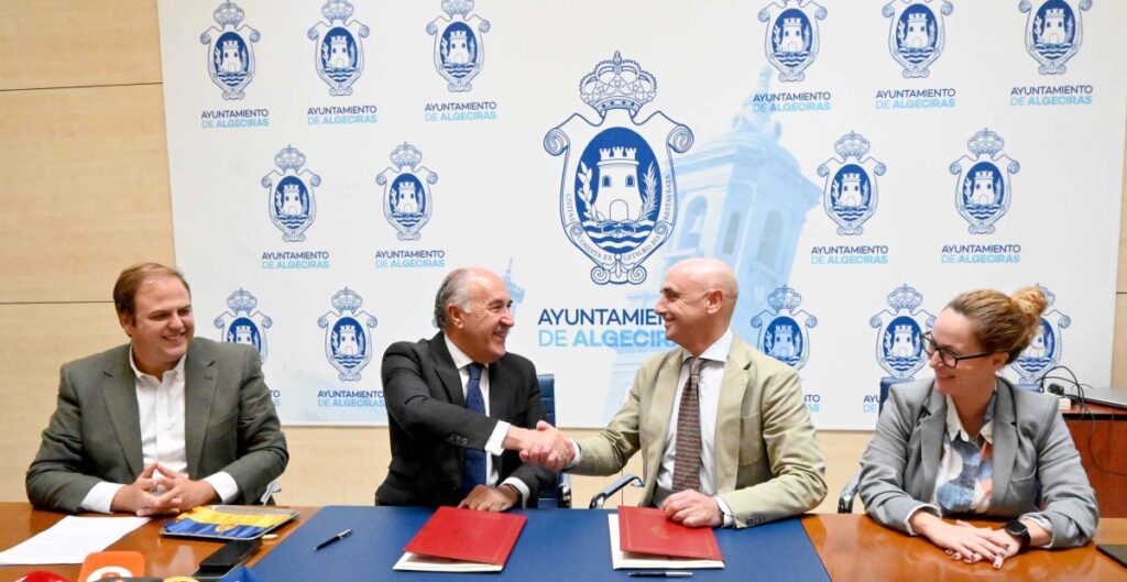 El alcalde de Algeciras, José Ignacio Landaluce, y el responsable de la Fundación MOEVE en Andalucía, Jesús Velasco, han firmado un convenio de colaboración por el que la entidad financiará las obras de instalación del vallado perimetral y la colocación de la señalética informativa en el humedal de la Huerta de las Pilas.