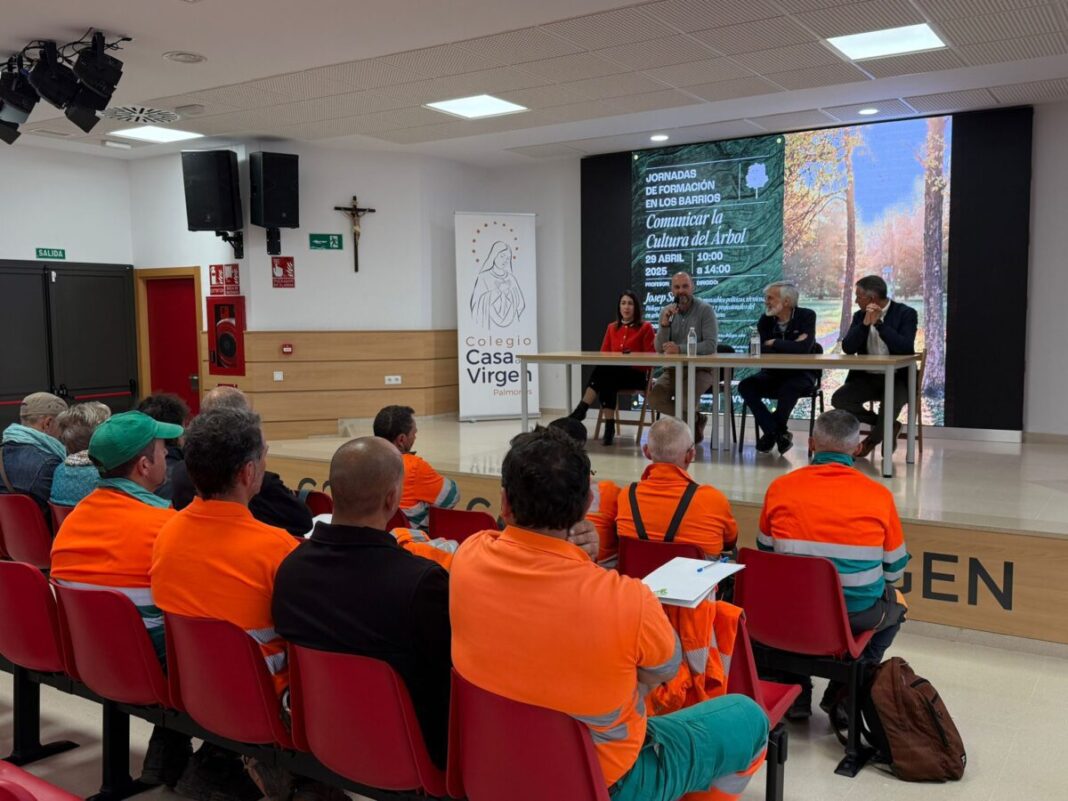La jornada de formación «Comunicar la cultura del árbol» se desarrolló en el colegio Casa de la Virgen de Palmones, en el municipio de Los Barrios, con la participación de profesionales de la jardinería, incluidos trabajadores de la empresa concesionaria del mantenimiento de parques y jardines Valoriza.