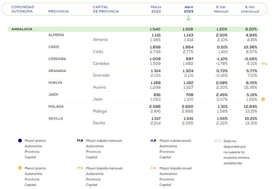 Andalucía se situó a la misma distancia de la autonomía más cara, Baleares (4.045 €/m²), que, de la más barata, Extremadura (804 €/m²).  En cuanto a la vivienda de segunda mano en España, en abril de 2023 registró un precio medio de 2.043 euros por metro cuadrado, arrojando un ascenso mensual del 1,35%. De un año a otro, la cifra registrada marcó una subida del 7,22%.