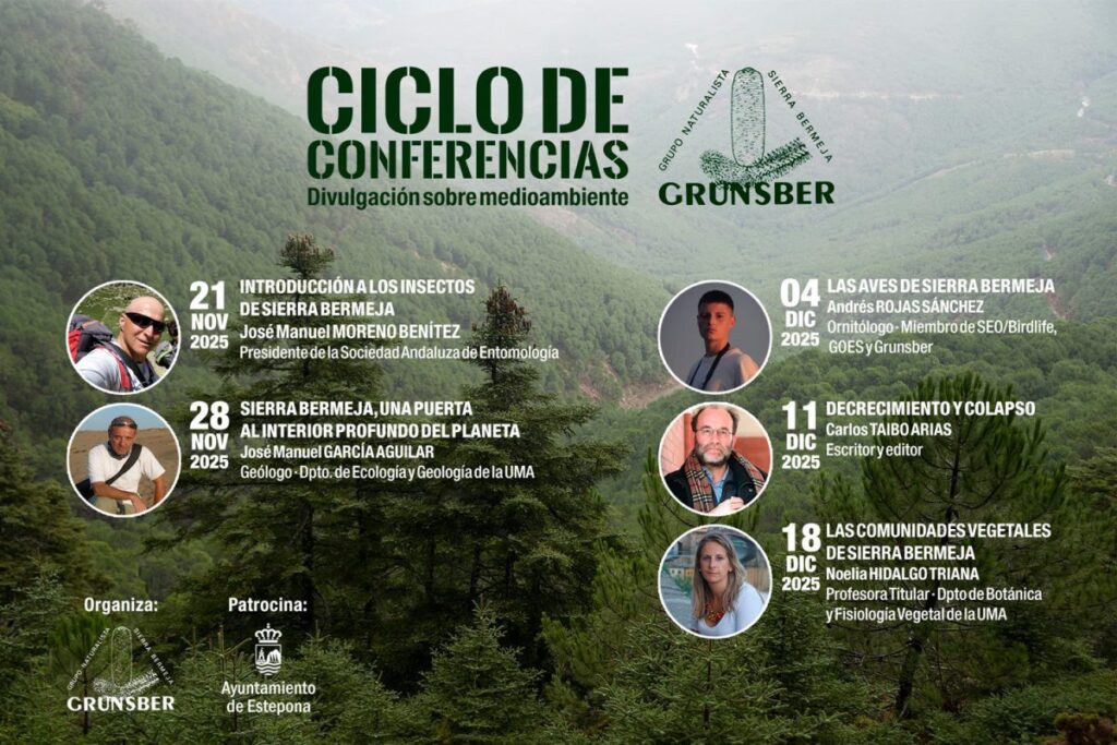 La organización Grunsber ha organizado cinco conferencias sobre medio ambiente y Sierra Bermeja en Estepona durante el último trimestre de 2025. El programa incorpora disciplinas como entomología, geología, ornitología y botánica, junto con una ponencia sobre el agotamiento de recursos naturales y el modelo de consumo capitalista.