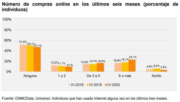 La mitad de los internautas (49,5%) realizó alguna compra a través de Internet entre junio y diciembre de 2020; y más del 95% de estos individuos recibieron algún paquete asociado a dichas compras online. La paquetería sigue creciendo gracias al comercio electrónico y se ha convertido en un pilar del sector postal, dado que el 75% de los españoles ya no recibe cartas de particulares y casi el 39% no recibe cartas de empresas.
