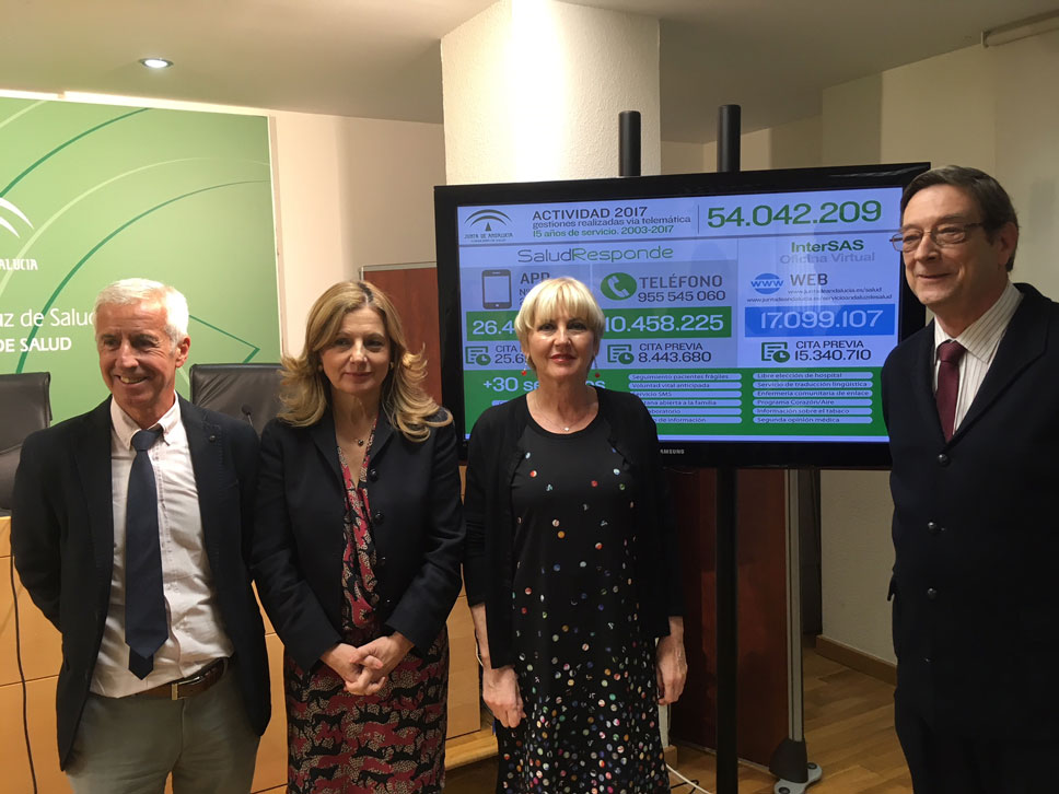 La población andaluza realizó durante 2017 más de 54 millones de gestiones con el sistema sanitario público andaluz a través de las vías telemáticas InterSAS y Salud Responde, lo que supone una media de 150.000 gestiones cada día. Estas cifras suponen un incremento del 23,8% con respecto a 2016, año en el que estas gestiones ascendieron a algo más de 43 millones. Así lo ha dado a conocer hoy la consejera de Salud, Marina Álvarez, durante la rueda de prensa que ha ofrecido de balance de la actividad y el uso que hace la ciudadanía de los dos principales canales que la Consejería de Salud pone a disposición de sus usuarios, para contactar y realizar diversas gestiones y consultas con los centros, y con la propia Administración sanitaria.