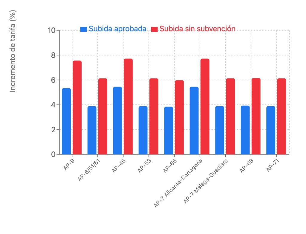 Como se puede observar en el gráfico, las mayores subidas corresponden a la AP-46 y la AP-7 Alicante-Cartagena con un 5,45%, seguidas por la AP-9 con un 5,34%. En el extremo opuesto, la AP-66 tendrá el menor incremento con un 3,84%. Las barras rojas muestran lo que habría sido la subida sin la subvención gubernamental, que en algunos casos llegaba al 7,72%.