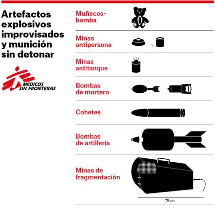 El constante cambio de posición de las líneas de frente deja un paisaje sembrado de minas, trampas explosivas y munición sin detonar en el que cientos de civiles han perdido la vida o han resultado mutilados por estos artefactos. Los explosivos se encuentran “plantados” en carreteras, campos de cultivo y también en las propias viviendas de la población, indica el nuevo informe de MSF. El reporte se ha basado en testimonios de los equipos médicos de la ONG en el norte de Siria, de pacientes y de sus familiares.
