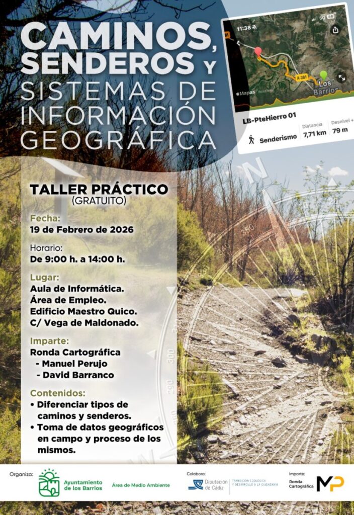 El Ayuntamiento de Los Barrios, a través del Área de Medio Ambiente dirigida por el concejal Antonio Dávila, ha organizado el taller práctico gratuito «Caminos, Senderos y Sistemas de Información Geográfica», una propuesta formativa destinada a acercar a la ciudadanía el conocimiento y manejo de herramientas vinculadas al análisis del territorio. La actividad, abierta a cualquier vecino, se celebrará el jueves 19 de febrero de 2026, en horario de 9:00 a 14:00 horas, en el Aula de Informática del Área de Empleo, en el Edificio Maestro Quico (C/ Vega de Maldonado).