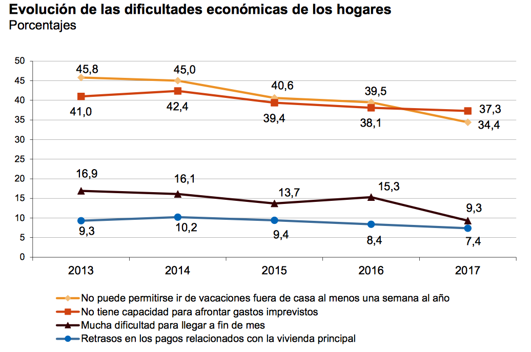 Por su parte, el 37,3% de los hogares no tuvo capacidad para afrontar gastos imprevistos, frente al 38,1% del año 2016.