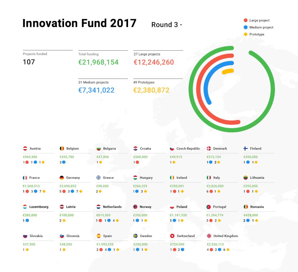 Se han dado a conocer quiénes han recibido financiación en esta tercera ronda: un total de 107 proyectos en 27 países, a los que se va a ofrecer 21.968.154 euros. En esta edición se recibieron un total de 988 propuestas de proyectos de 27 países. De los 107 que van a recibir financiación, 49 se centran en prototipos (proyectos en su primera etapa que precisan hasta 50.000 euros de financiación), 31 son proyectos de tamaño medio (que requieren hasta 300.000 euros de financiación) y 27 son grandes proyectos (que precisan hasta 1 millón de euros financiación).