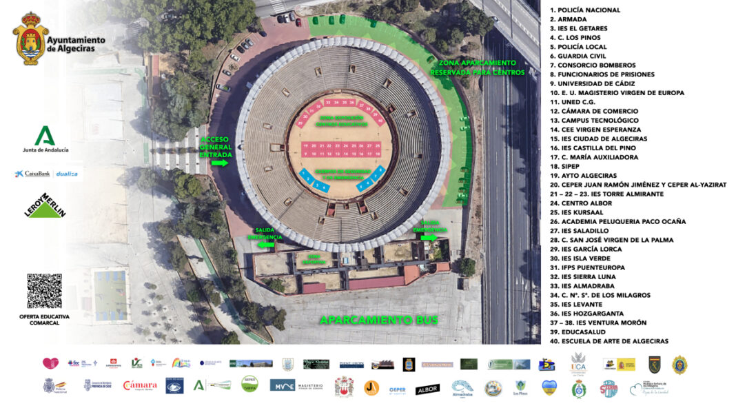 Así, habrá 40 carpas en las que se encontrarán las Fuerzas Armadas; la Policía Nacional; la Policía Local; la Guardia Civil; el Consorcio Provincial de Bomberos; los funcionarios de prisiones; el Campus Bahía de Algeciras de la Universidad de Cádiz; el Centro de Magisterio “Virgen de Europa”; el Centro Asociado de la UNED; la Cámara de Comercio del Campo de Gibraltar; la Fundación Campus Tecnológico; las delegaciones municipales de Fomento y Empleo y de Juventud; la Red de Dinamizadores de FP Dual de la Junta de Andalucía; el colegio de Educación Especial Virgen de la Esperanza; los institutos públicos El Getares, Ciudad de Algeciras, Torre Almirante, Kursaal, Saladillo, García Lorca, Isla Verde, Levante y Ventura Morón de Algeciras; Castilla del Pino de San Roque; Sierra Luna de Los Barrios; Almadraba de Tarifa; y Hozgarganta de Jimena; la Escuela de Arte “Algeciras”; los centros y colegios Los Pinos, María Auxiliadora-Salesianos, Paco Ocaña, Puenteuropa, Nuestra Señora de Los Milagros, EducaSalud y San José-Virgen de la Palma de Algeciras; y Albor-Casa de la Virgen de Los Barrios; el SIPEP ‘Entre Dos Aguas’ y los centros de educación permanente Juan Ramón Jiménez y Al-Yazirat.