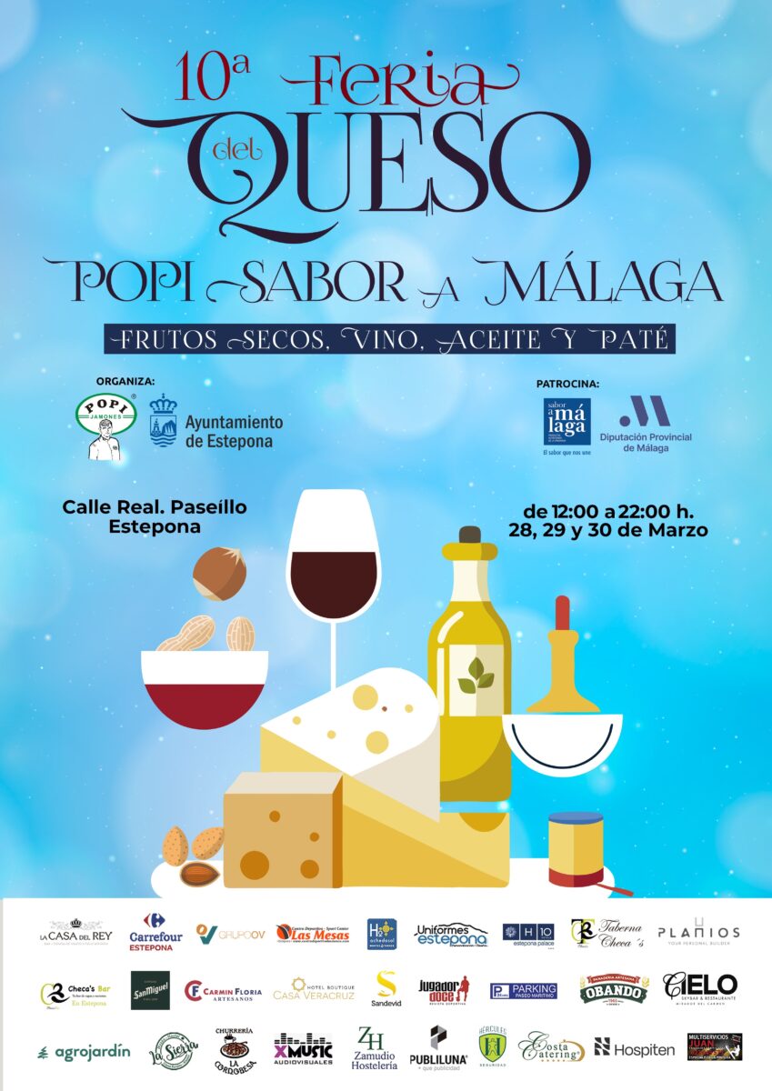 La X Feria del Queso ‘Popi’ Sabor a Málaga reunirá a más de una treintena de empresas en la calle Real de Estepona del 28 al 30 de marzo, en horario de 12:00 a 22:00 horas. La feria, impulsada por el Ayuntamiento de Estepona y el cortador profesional de jamón José María Téllez ‘Popi’, cuenta con la colaboración de la Diputación de Málaga a través de la marca ‘Sabor a Málaga’. El evento busca promocionar la calidad y variedad de los quesos y derivados lácteos elaborados por las empresas participantes, un 80% de las cuales son de la provincia de Málaga.