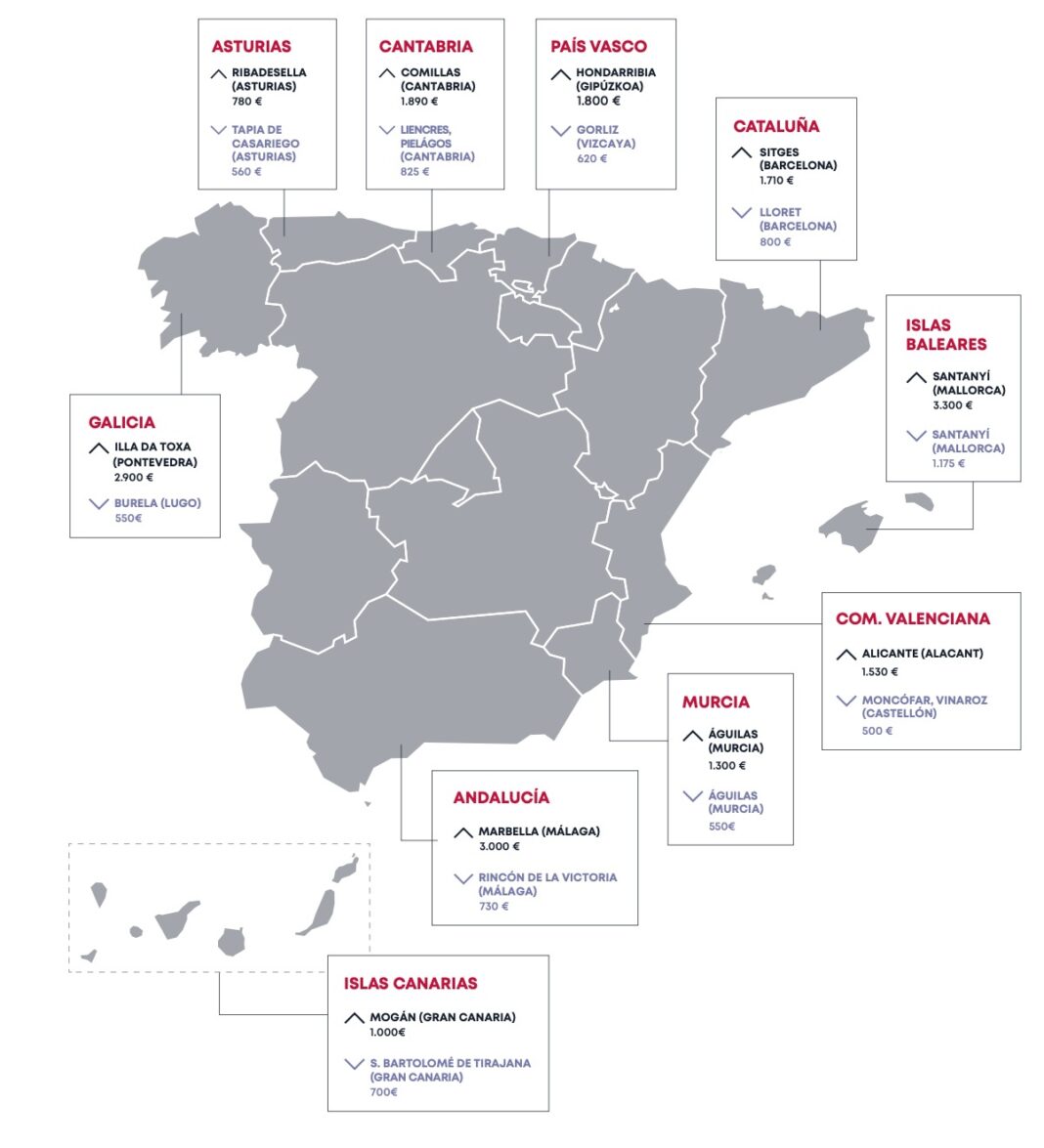 Por el contrario, según el estudio de Grupo Tecnitasa, las comunidades que mayor diferencia de precios tienen entre lo más exclusivo y lo más económico, con importes que superan los dos mil euros semanales, son: Galicia, Andalucía e Islas Baleares.